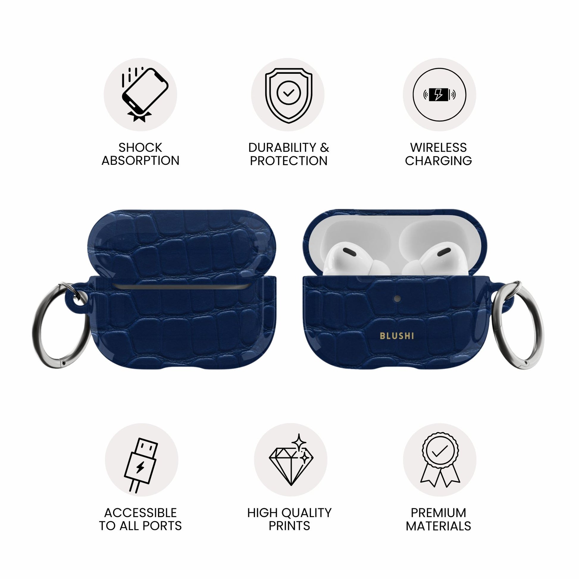 Chez BLUSHI, chaque étui est confectionné avec soin en Europe à partir de matériaux haut de gamme, arborant une finition brillante et élégante ainsi que des imprimés éclatants et inaltérables. Des designs audacieux aux créations minimalistes, vos AirPods deviennent un accessoire de mode aussi unique que vous.